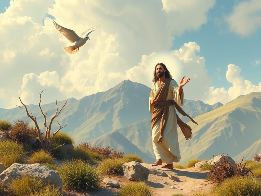 A striking image of Jesus, guided by the Holy Spirit, in the desolate wilderness of Judea, as depicted in Christian art. The scene is set against a dramatic backdrop, emphasizing the spiritual journey of Jesus.