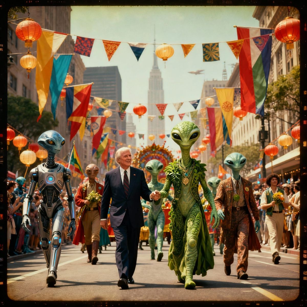 Festa dell' amicizia con gli alieni. Città con strade addobbate a festa ed un corteo aperto da un politico terrestre ed un ospite vegano Cinematic film still, shot on v-raptor XL, film grain, vignette, color graded, post-processed, cinematic lighting, 35mm film, live-action, best quality, atmospheric, ...