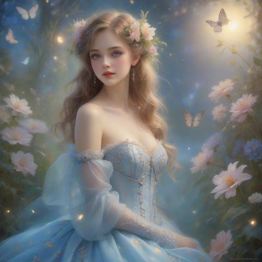 This image shows an elegant woman with blue eyes in a moonlit garden. She wears a corset dress, exhibiting gentle, shy smile with soft lighting, in a surreal, romantic fantasy aesthetic.