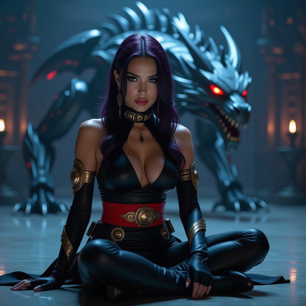 A striking picture of a woman with dark violet hair and futuristic accessories in a dimly lit chamber, accompanied by a mech-dragon. The image has low-key lighting and soft focus, in a cyberpunk aesthetic.