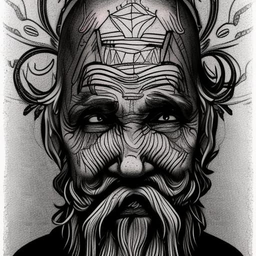 This striking image features an elderly man depicted in a tribal tattoo style. The black and white line art illustration is suitable for coloring.