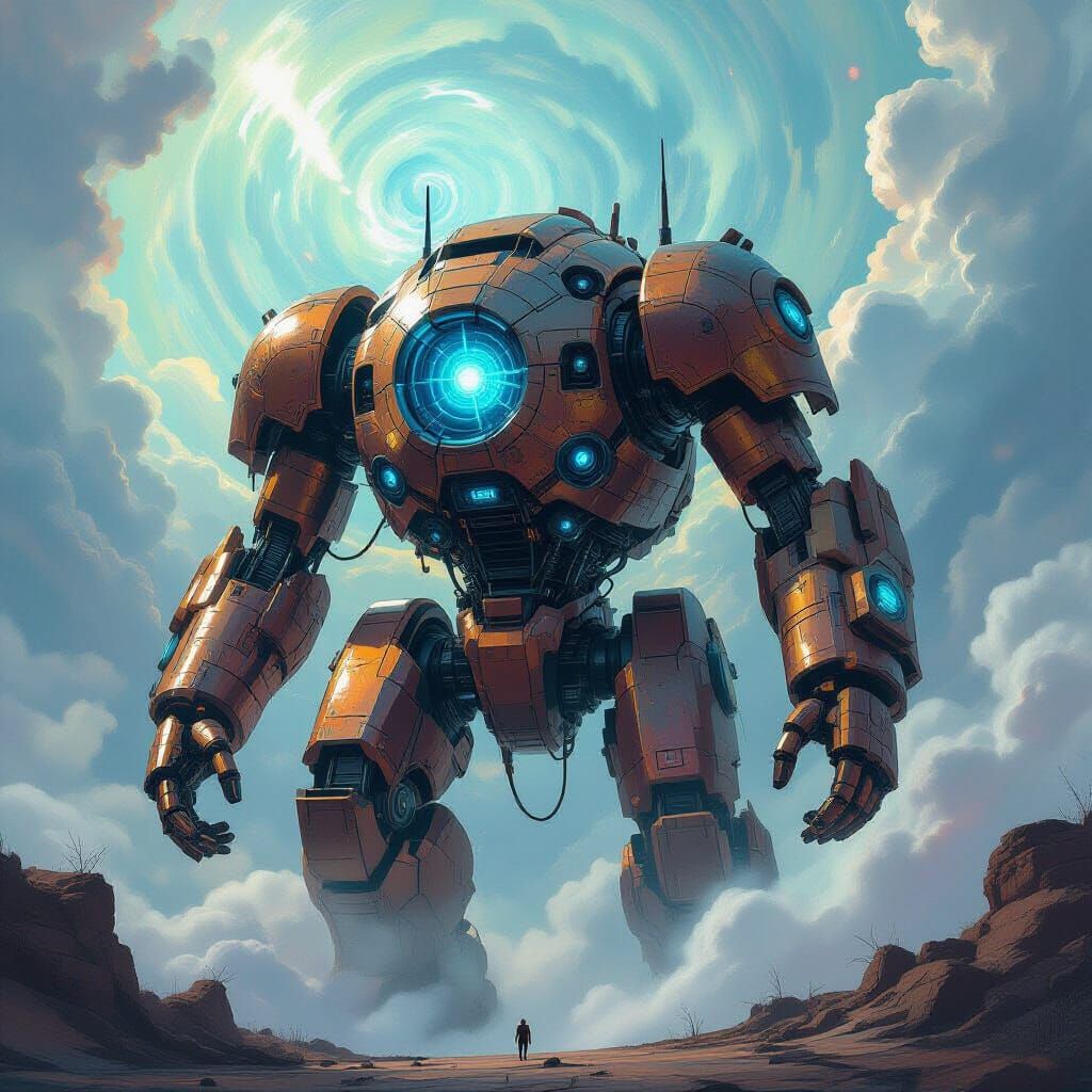 A striking picture of a giant, rusty, metallic robot harvesting energy from a stormy planet. The robot's body dissolves into swirling clouds, rendered with dynamic brushstrokes and impasto textures in a romantic, ethereal style.