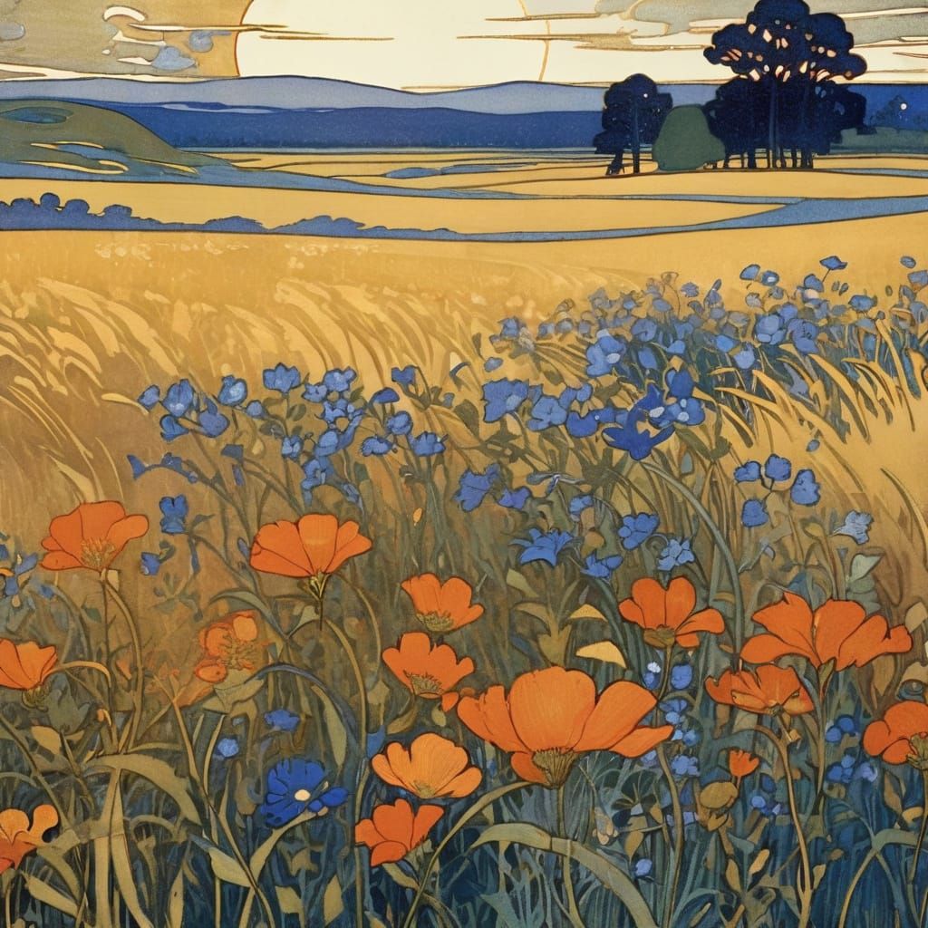 This image shows a field of indigo wildflowers in bloom, captured in a medium shot. The art nouveau illustration features delicate petals, soft textures, and a warm, golden light.
