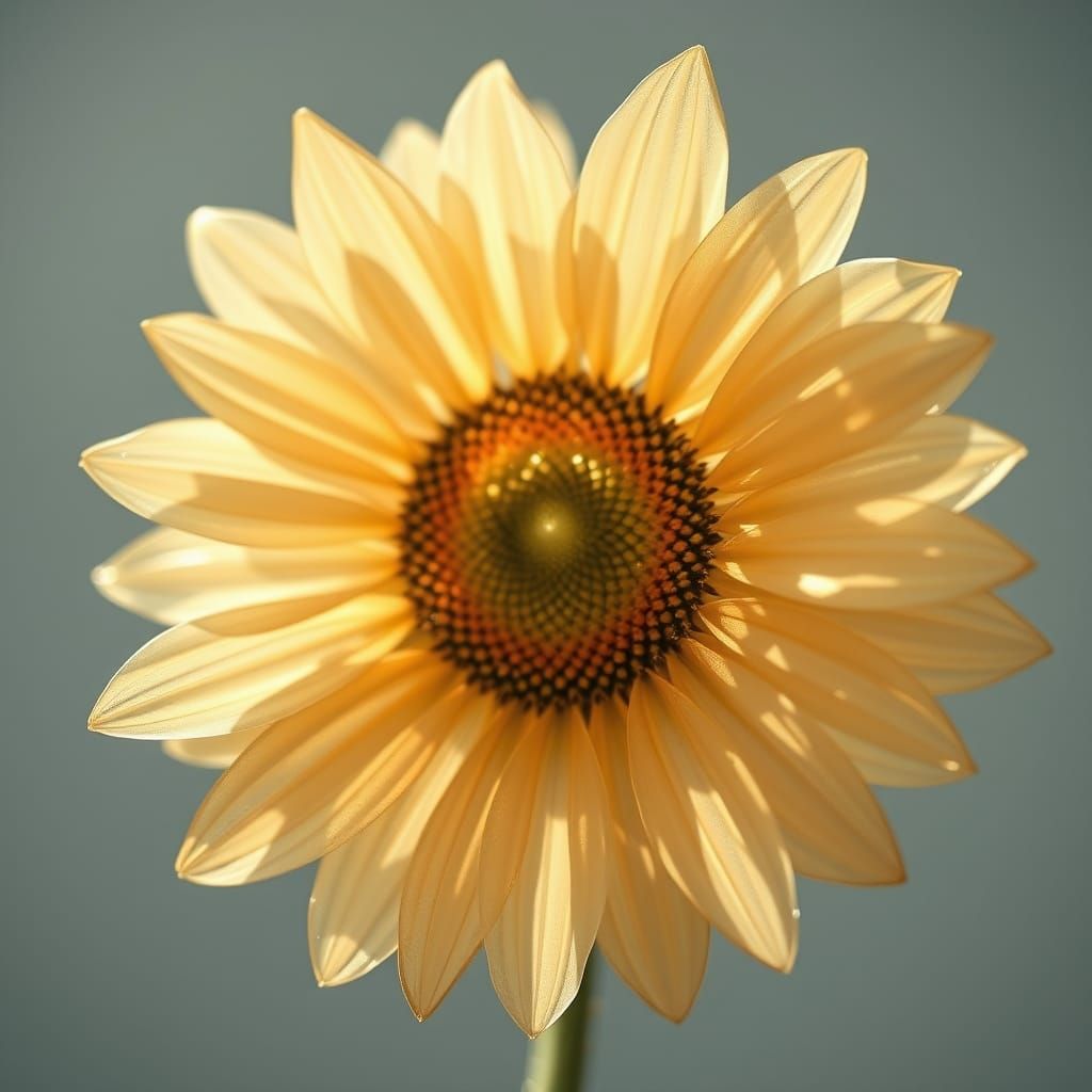 This image shows a delicate, transparent sunflower with a soft, luminous glow, reminiscent of a dreamy, hyper-realistic style with a predominantly light color palette.