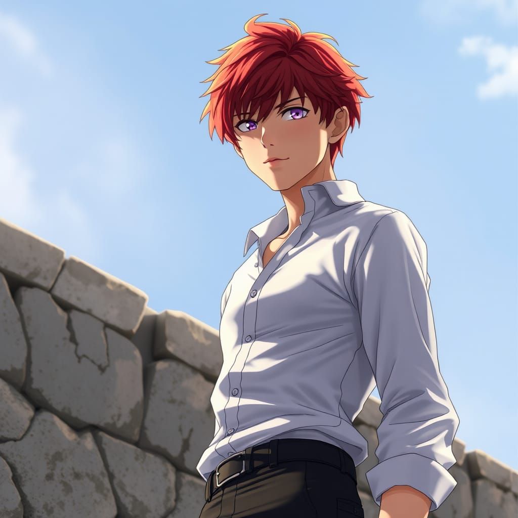 This image shows a young man with red hair and purple eyes standing on a stone wall in sunlight. It is rendered as detailed 3D anime art with an emphasis on realism and vibrant color.