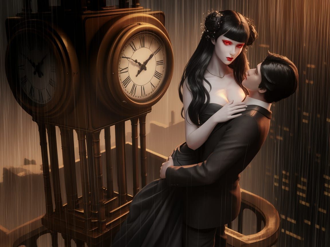 This image shows a beautiful woman with red eyes and black hair, reminiscent of 1920s style, in a loving embrace with her husband on a clock tower, with gentle rain and a hazy cityscape.