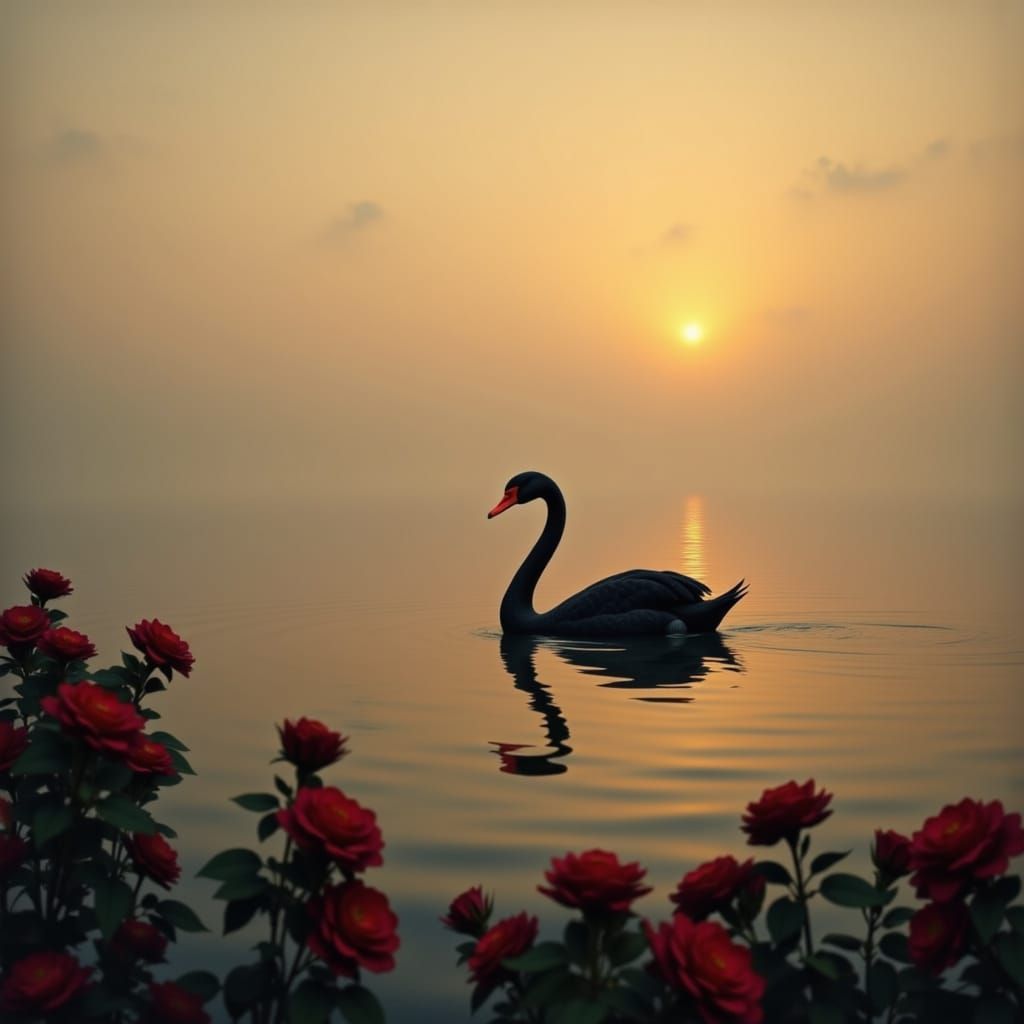 A striking picture of a black swan on a misty lake at sunrise, encircled by red roses. The image is lit with cinematic lighting and is rendered with photorealistic details in a film noir style.