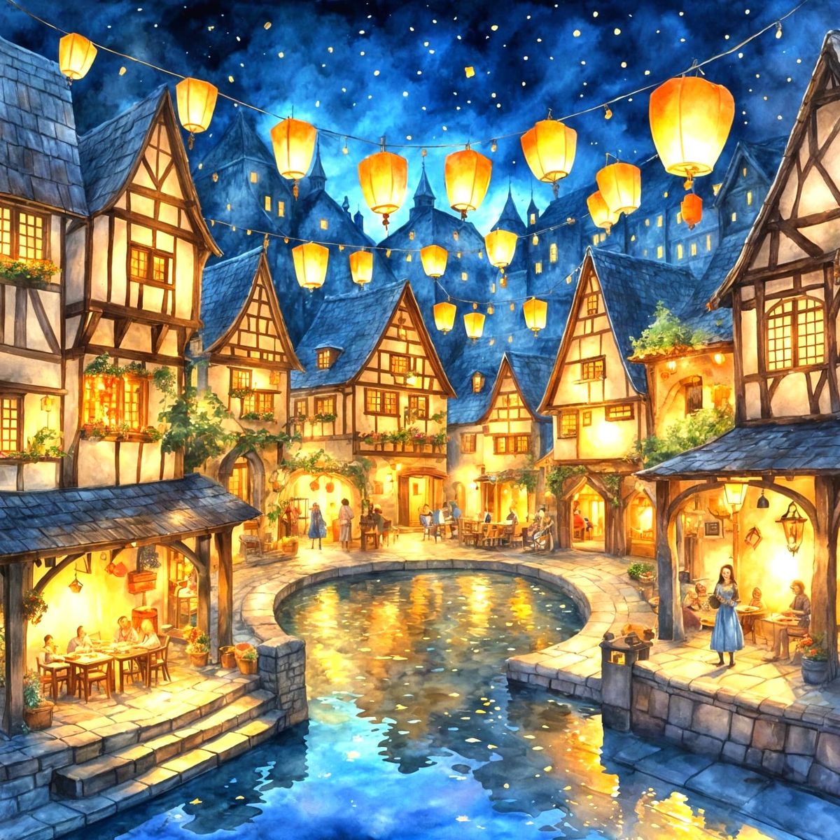This image shows a tranquil medieval village square illuminated by paper lanterns. Halflings gather near a fountain in this watercolor scene. The artwork evokes a fairy tale with a cozy atmosphere.