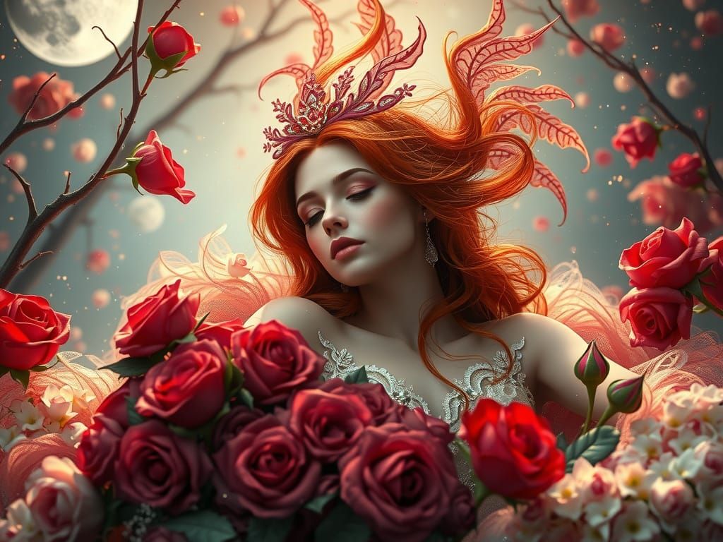 A stunning portrait of a princess surrounded by red roses. Her red hair floats around her, illuminated by fireflies and moonlight. The image has a dreamlike, pop surrealist aesthetic.