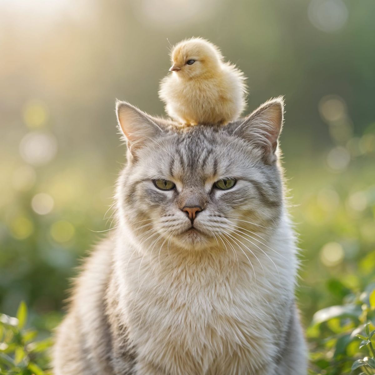 "description": "Peaceful morning scene titled \"Cat's Peaceful Morning\": a calm, gentle cat sitting quietly with a serene expression, eyes half-closed in contentment. Soft golden morning light bathes the scene, creating warm highlights and delicate shadows across the cat’s fur. A tiny yellow chick ...