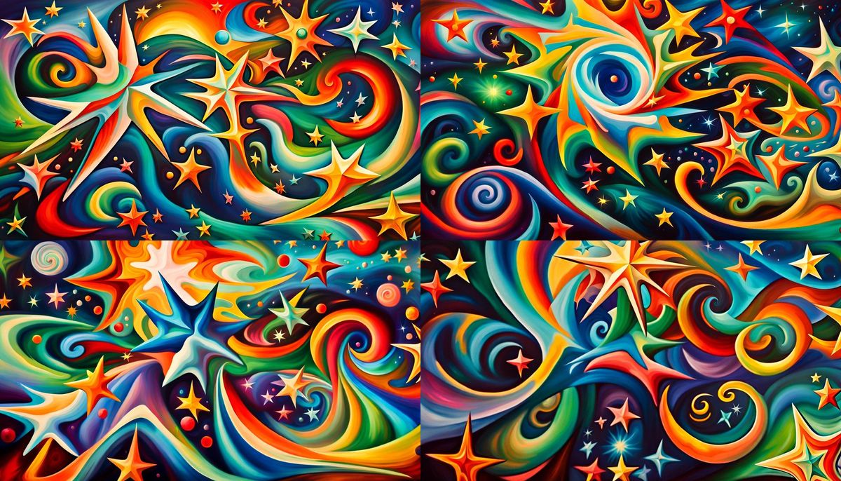 A striking picture of five newborn stars surrounded by electromagnetic coils within a plasma maelstrom. This vivid image, set against a background of countless stars, is rendered as a rich impasto oil painting.
