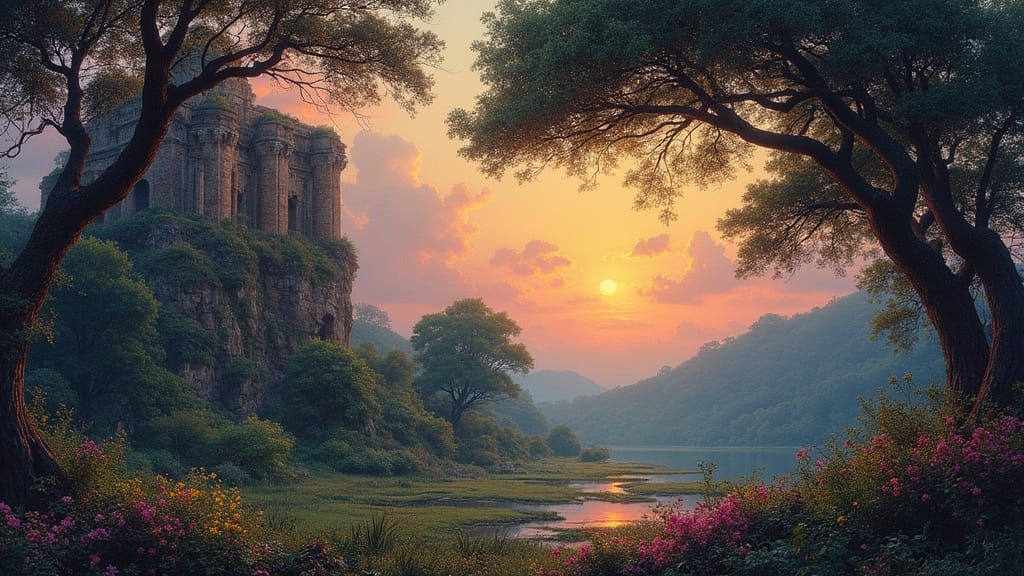 This image depicts a mystical evening scene where vibrant colors and whimsical magic emanate from a backdrop of ancient ruins and towering tree clusters.