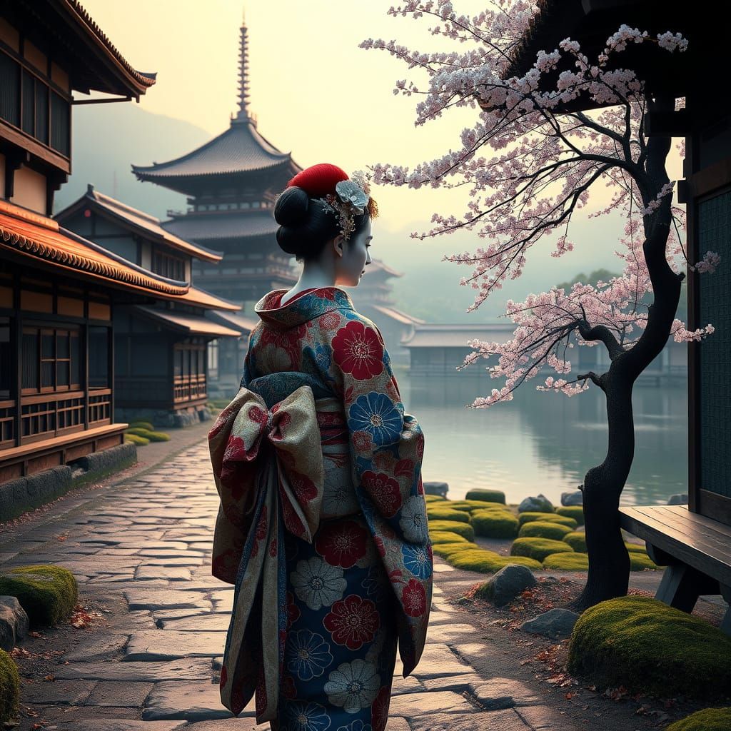 This image shows a geisha in a colorful kimono walking through a Japanese village at dawn. Moss-covered buildings, a serene lake, and a cherry blossom tree add to the ukiyo-e aesthetic.