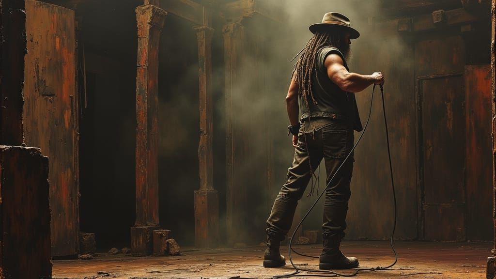 A poignant oil painting of a charismatic older black singer performing on a smoky bayou-bar stage, with a focus on gritty textures and detailed realism reminiscent of dystopian landscapes and post-apocalyptic art.