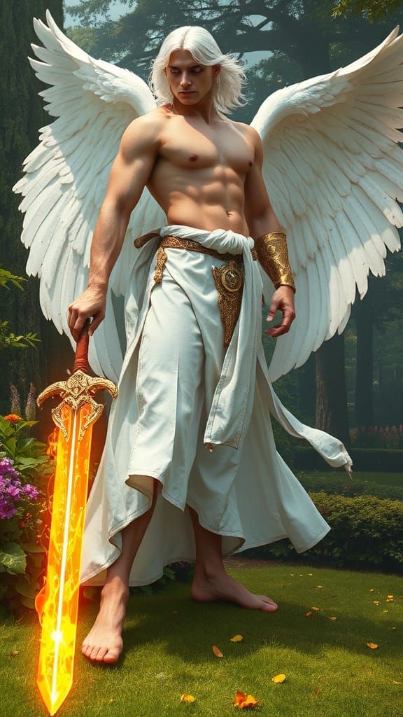 This stunning image depicts a powerful, muscular angel in a photorealistic garden setting, surrounded by lush greenery and vibrant flowers, with a mighty flaming sword in hand and magnificent wings outstretched, rendered in exquisite detail with a high dynamic range.