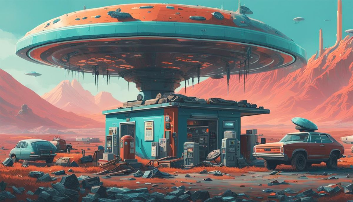 This image shows a futuristic gas station for alien travelers. The digital artwork features garbage, machinery, and UFOs in a zero-gravity, wet environment at sunset in a sci-fi aesthetic.