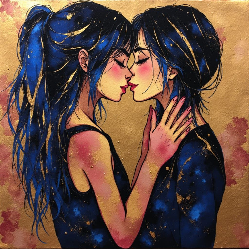 This mixed media painting captures two women in a tender kiss, featuring gold leaf, rose, and sapphire pigments on textured canvas. It evokes radiant closeness with metallic accents.