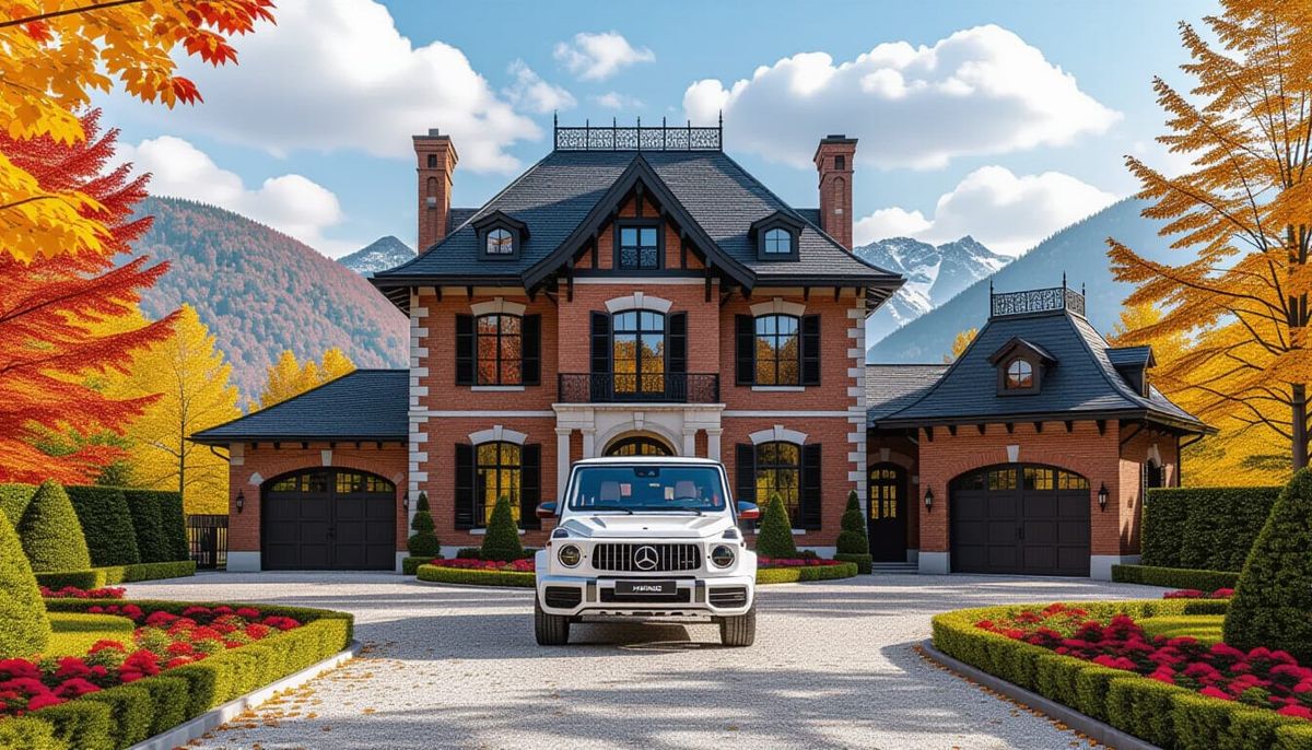 This image shows a grand Victorian chateau with a white Mercedes parked outside, surrounded by vibrant autumn trees and a flower garden under a blue sky with mountains. Rendered with painterly realism and visible brushwork.