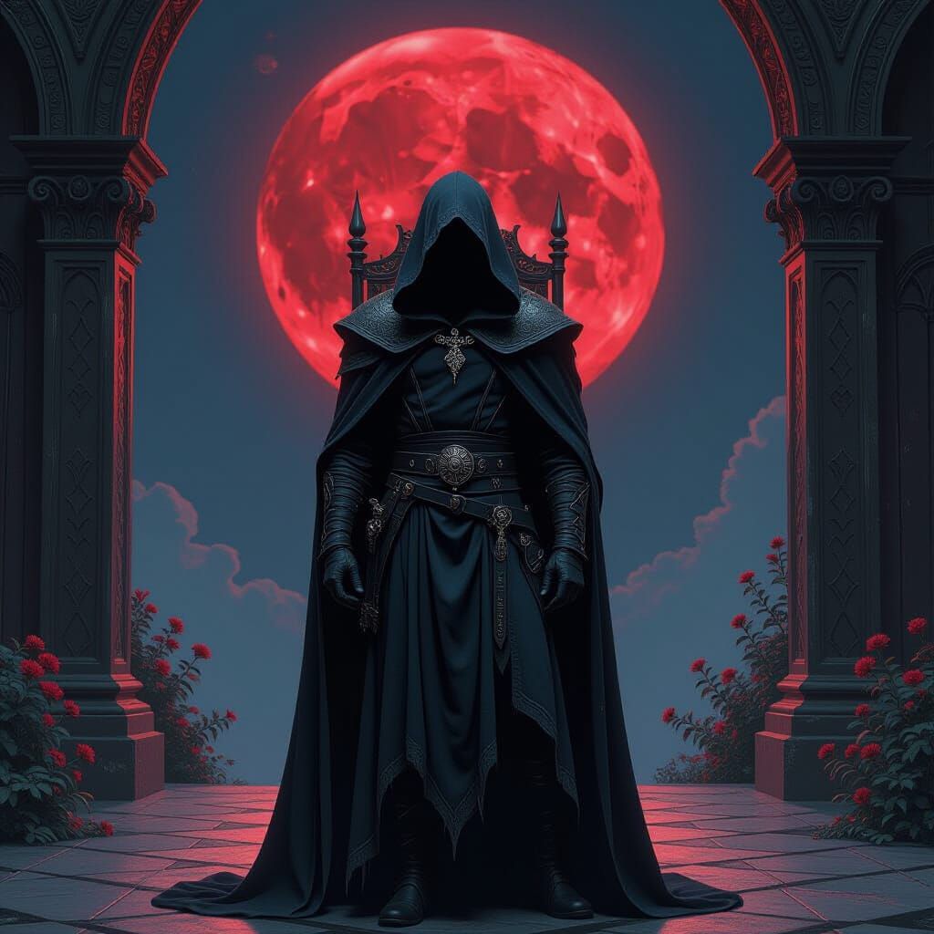 A dramatic image shows a thief captured in a fae court beneath a blood moon. The scene blends romanticism with whimsical and dark fantasy elements.