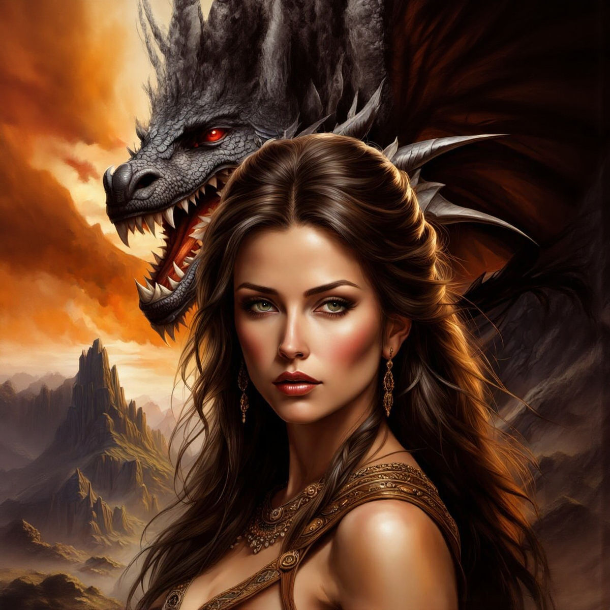 A hyperrealistic oil painting of a woman escaping a dragon's cave. She has tan skin, brown eyes and is wearing a detailed outfit. The work has a cinematic and dramatic atmosphere.