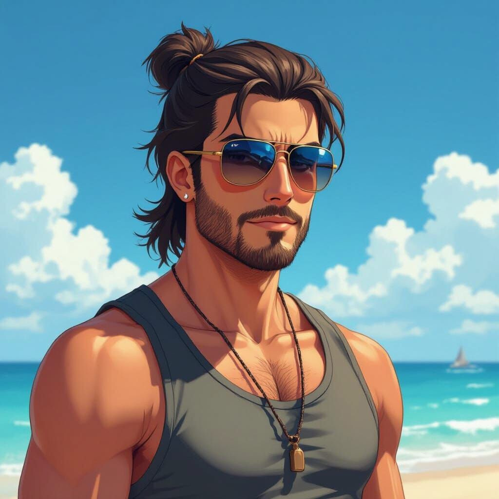 This image shows Eren Yeager on a beach, sporting sunglasses, a sleeveless shirt, and a manbun. The artwork features vibrant colors and dynamic poses in a digital art style.