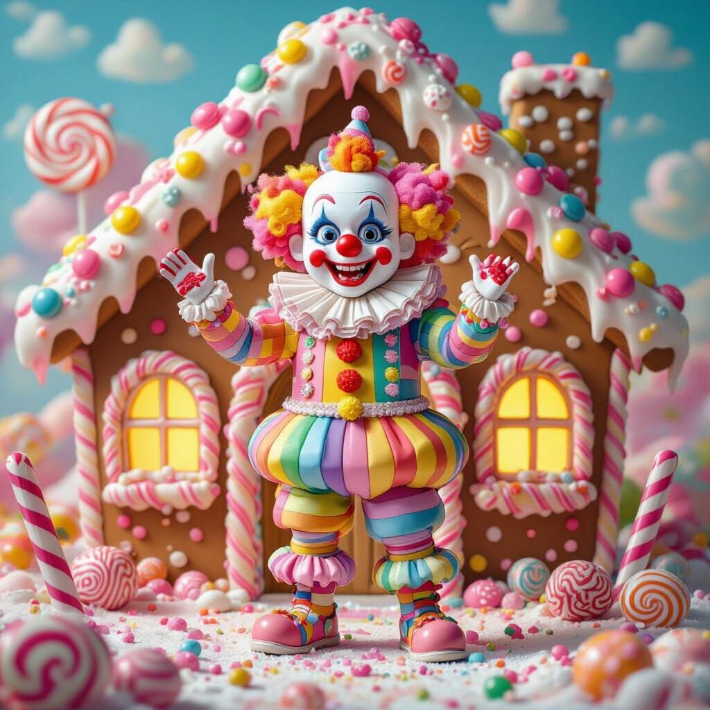 A whimsical candy clown in a pastel rainbow outfit stands inside a gingerbread house. The scene features a sugary pop art aesthetic with vibrant colors and playful patterns.