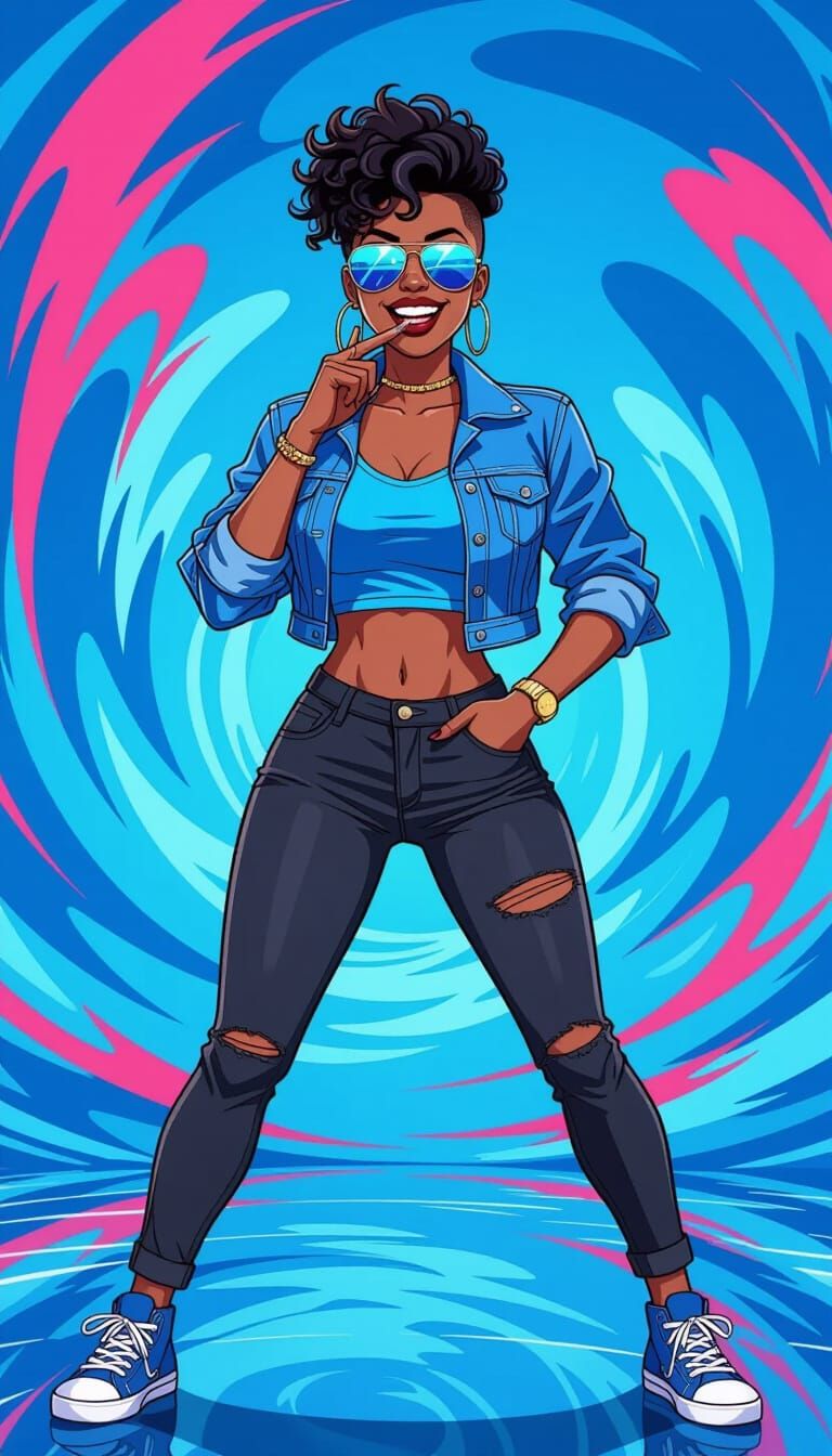 This image shows a stylish black woman with a confident pose, highlighted by vibrant colors and bold lines. The artwork uses a 2D cartoon style with high contrast shading.