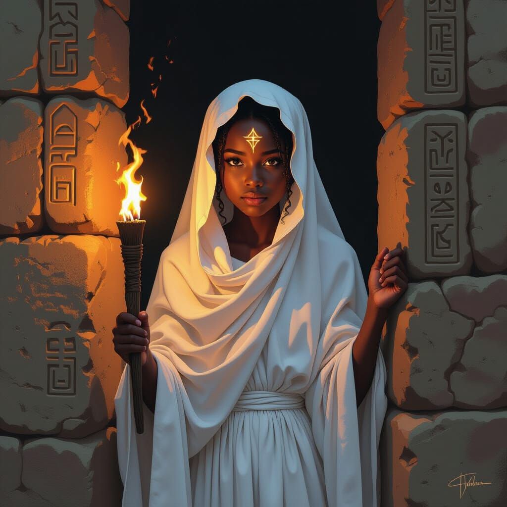 This image shows a young African girl holding a torch and opening an ancient stone door. Light illuminates her face and glowing symbols, in a vibrant digital painting style.