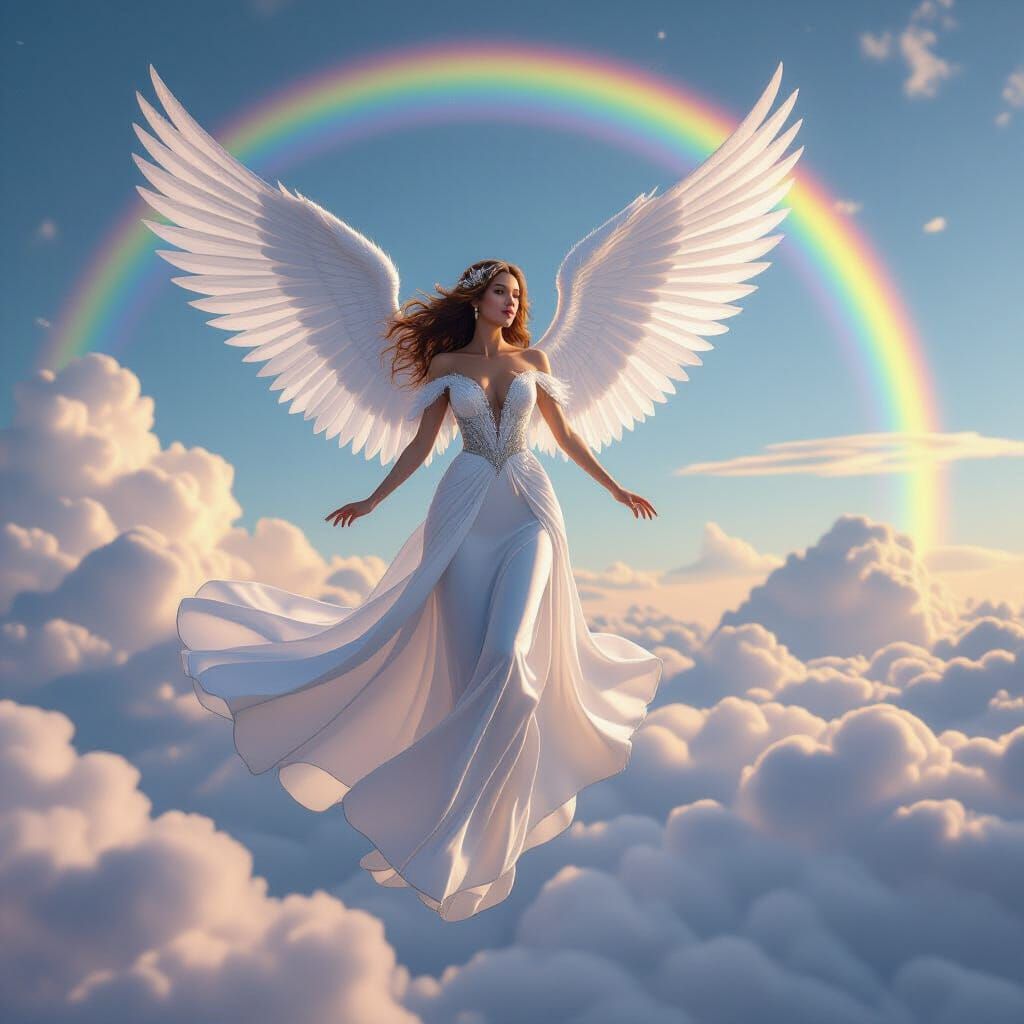 This image shows a beautiful woman with large, shimmering wings in a flowing white dress flying above fluffy clouds and a rainbow. The portrait features dramatic lighting and intricate details in a digital art style.