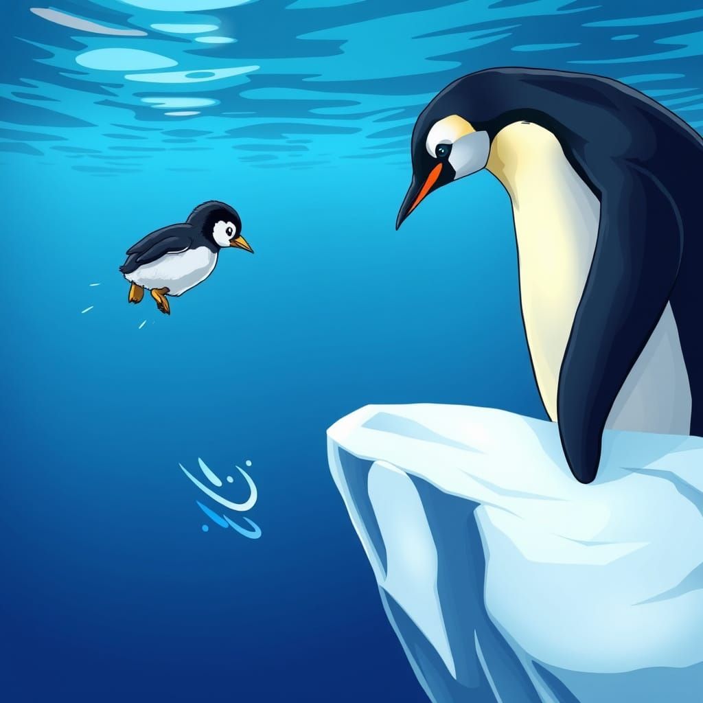 This image shows a cute cartoon penguin chick bravely leaping from an ice shelf into deep blue water, with an adult penguin swimming below. Features vibrant reflections and dynamic angles, rendered in a comic art style.