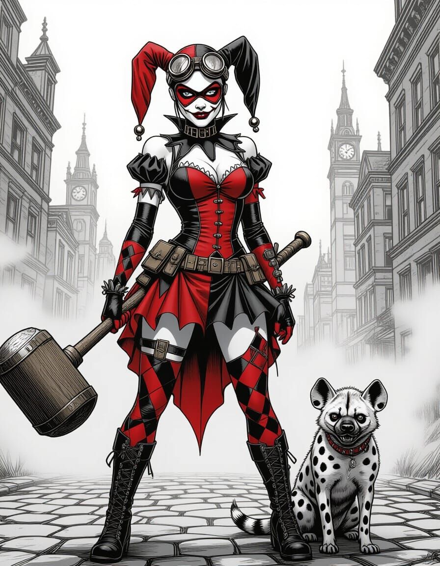This image shows Steampunk Harley Quinn in Victorian Gotham. She wears a jester dress and goggles, wielding a mallet, with a hyena companion. Pen and ink art creates bold lines and textures.