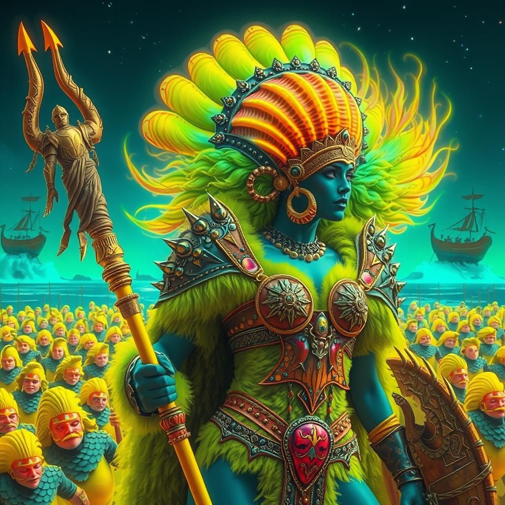 A surreal image shows an aquatic warrior leading fish men against Roman centurions. The scene features a vibrant, bioluminescent backdrop and is reminiscent of digital art with a fantasy aesthetic.