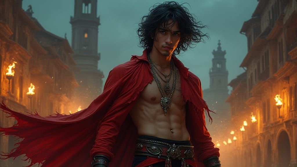 This image depicts a young man with sharp features, dark slicked-back hair, and a mocking smile, wearing an ostentatious red and black medieval tunic, excessive jewelry, and holding a sword, surrounded by torches, exuding confidence and menace, in a dark and dramatic fantasy style
