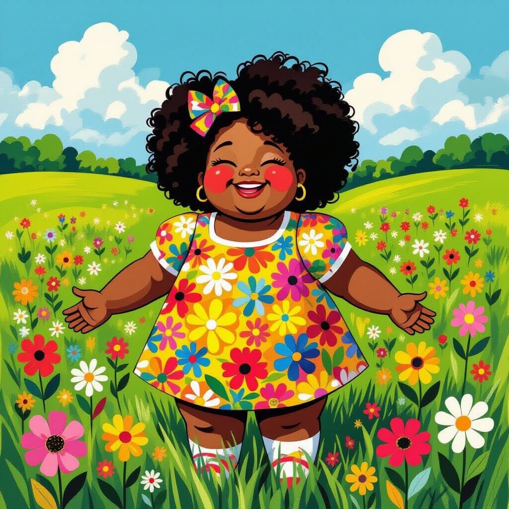A vibrant image of a smiling young black girl in a flower-filled meadow. The artwork features bold colors and patterns reminiscent of early 20th-century modern art.