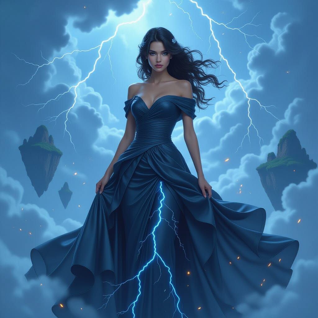 A striking image of a storm princess in a swirling sky realm. She wears a dark silk gown with electric blue accents, surrounded by storm clouds and lightning in a digital art style.
