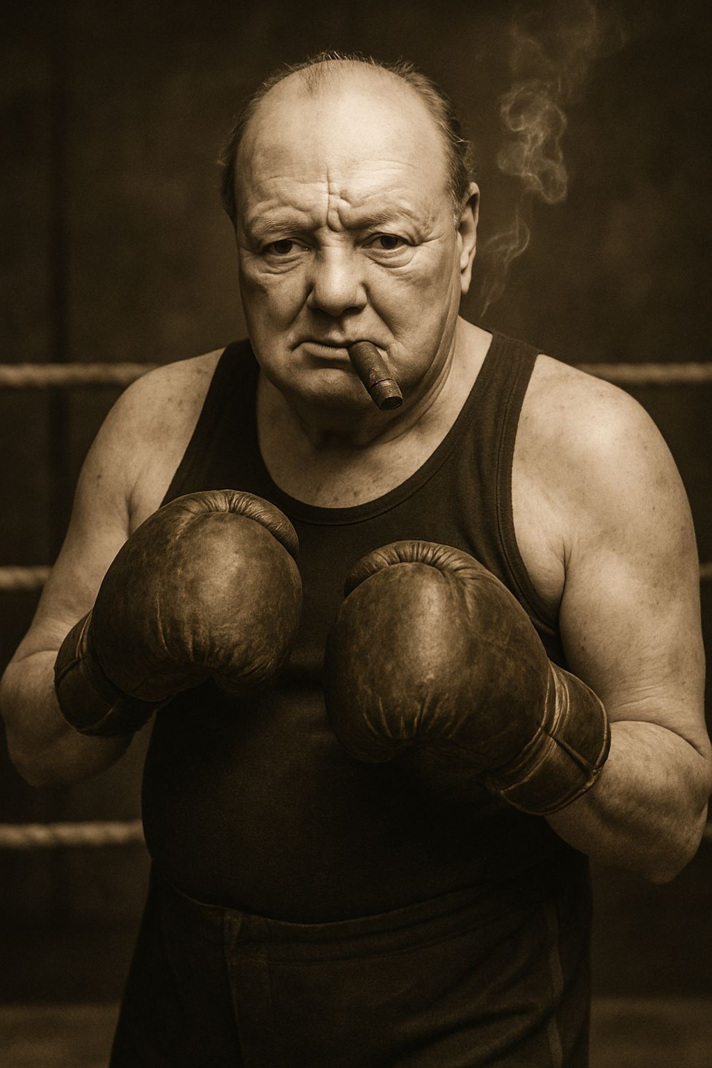 This image shows Winston Churchill reimagined as a boxer. He's in a boxing ring, wearing worn gloves and smoking a cigar, rendered with a gritty, vintage aesthetic.