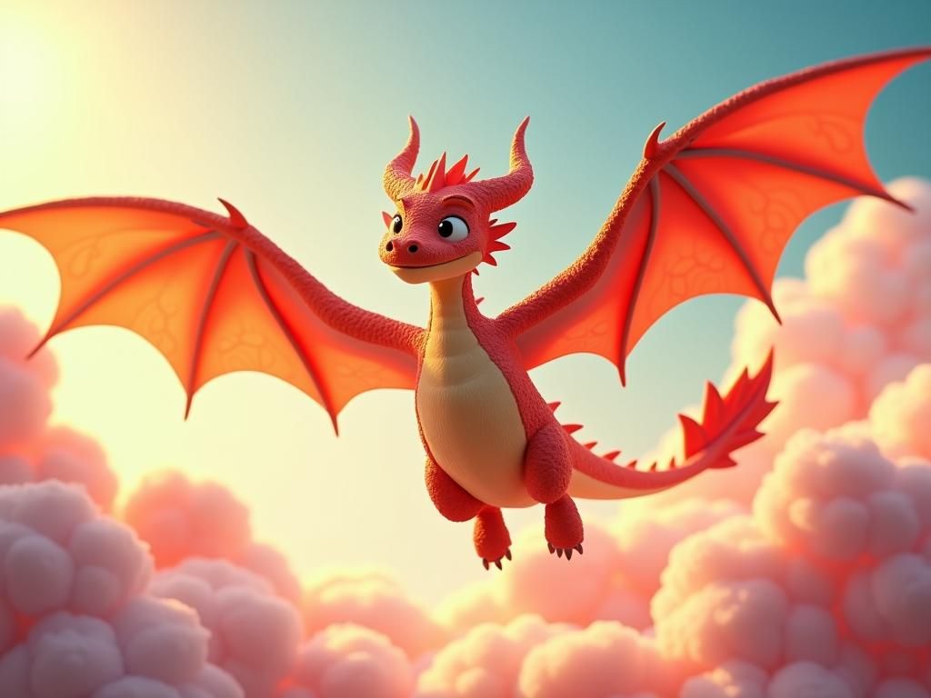 A vibrant 3D digital artwork of a colorful, fluffy dragon flying in sunlight. This image features bright colors and a radial gradient background, reminiscent of Pixar and Disney concept art.