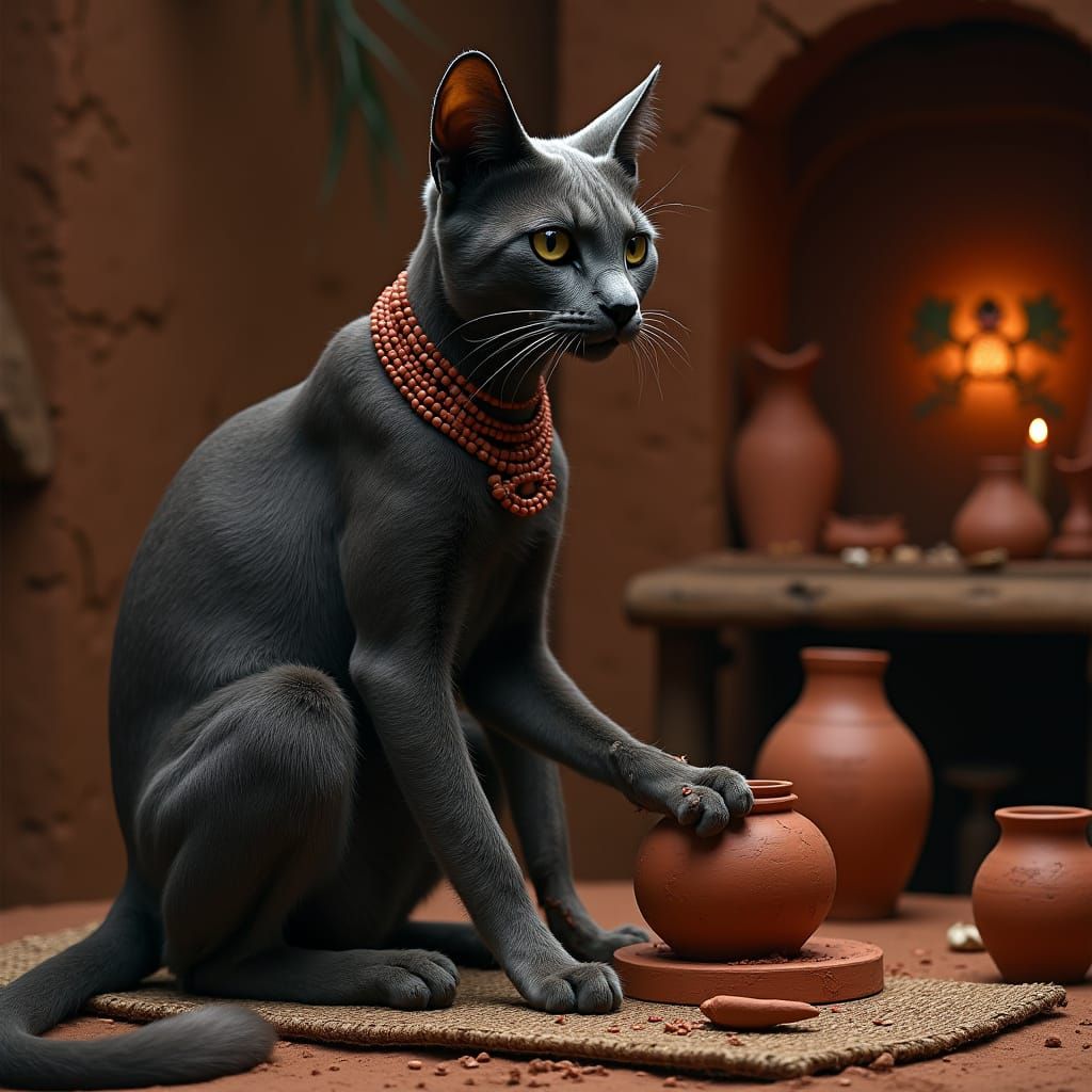 This image shows a regal charcoal cat crafting a terracotta sculpture, surrounded by finished works and traditional Igbo and Benin influences, in a mystical, dimly lit atmosphere