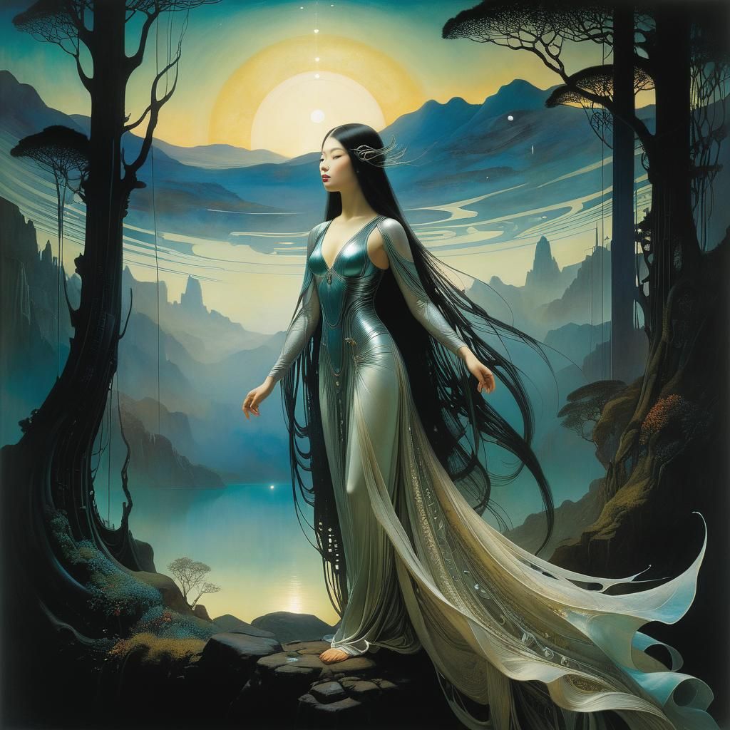 This image features an Asian North Star bathed in bright, pearlescent light, rendered in a style blending intricate detail with surreal, dark fantasy elements.