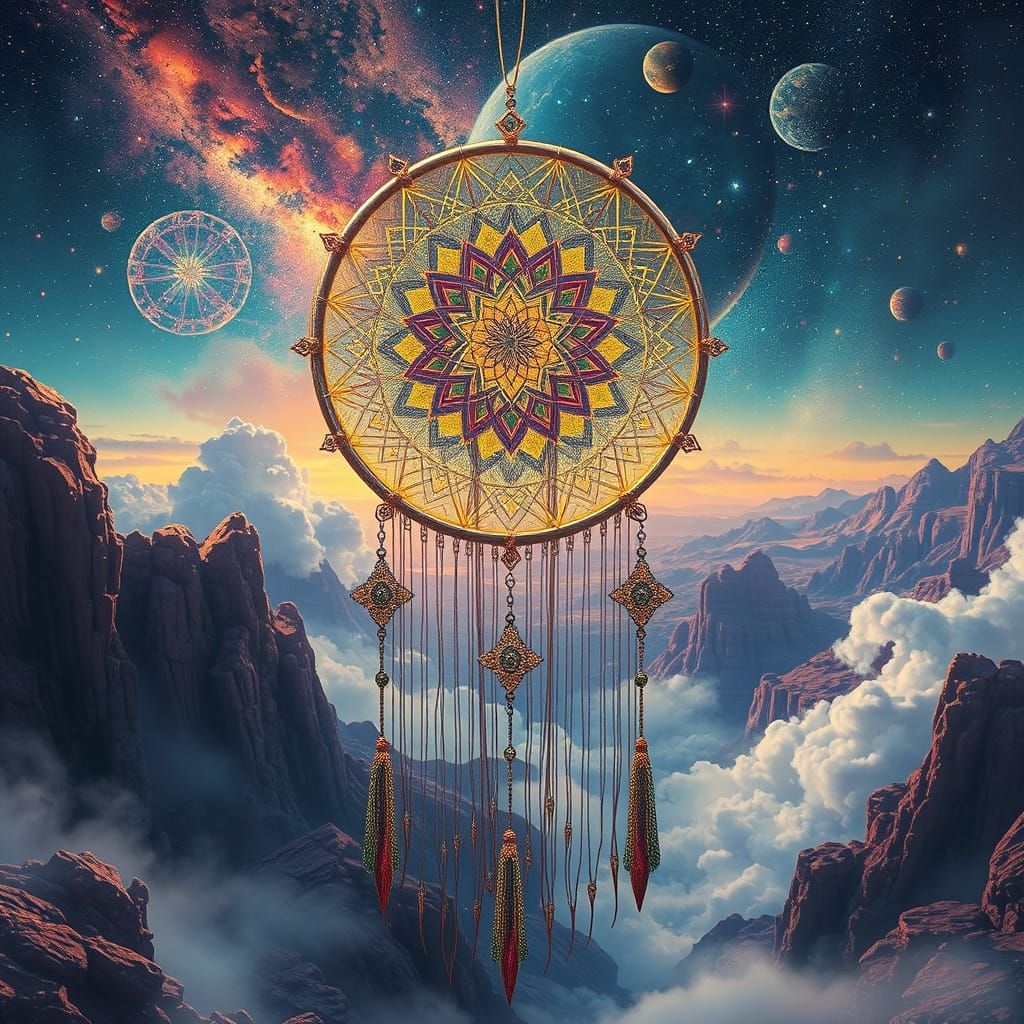 This image shows a celestial dreamcatcher weaving metallic threads amidst vibrant, otherworldly landscapes, blending futurism and mysticism in a mesmerizing cosmic scene.