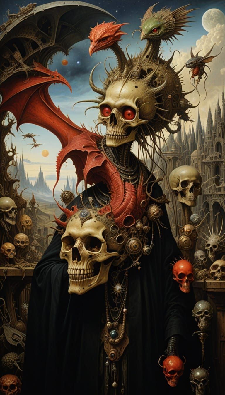 This image shows a detailed, hyperrealistic painting of a post-apocalyptic museum scene, featuring intricate designs and imperial colors. Inspired by the works of Max Ernst, H.R. Giger, and Hieronymus Bosch, this piece combines fantasy and surrealism in a captivating visual experience.