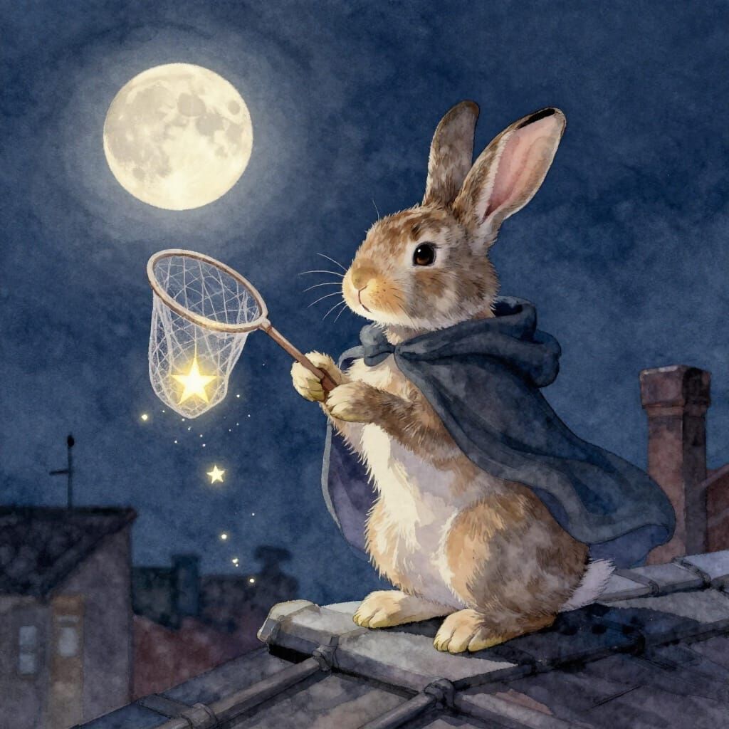 This image shows a rabbit in a night cloak on a rooftop, catching glowing falling stars in a net. Moonlight softly illuminates its fur. Rendered in a watercolour expressionist style.