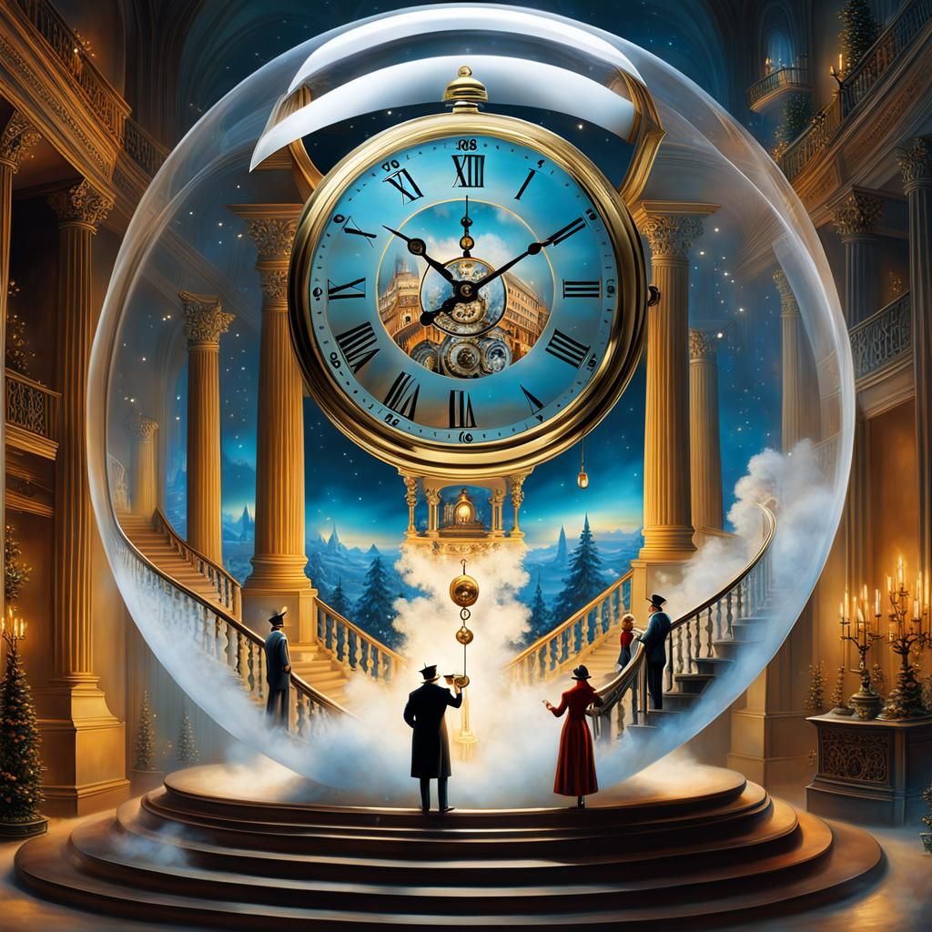 A surreal image of people celebrating New Year. The scene is viewed through a transparent clock, reminiscent of Dali's style. The dreamy, detailed artwork has a fantastical, ethereal quality.