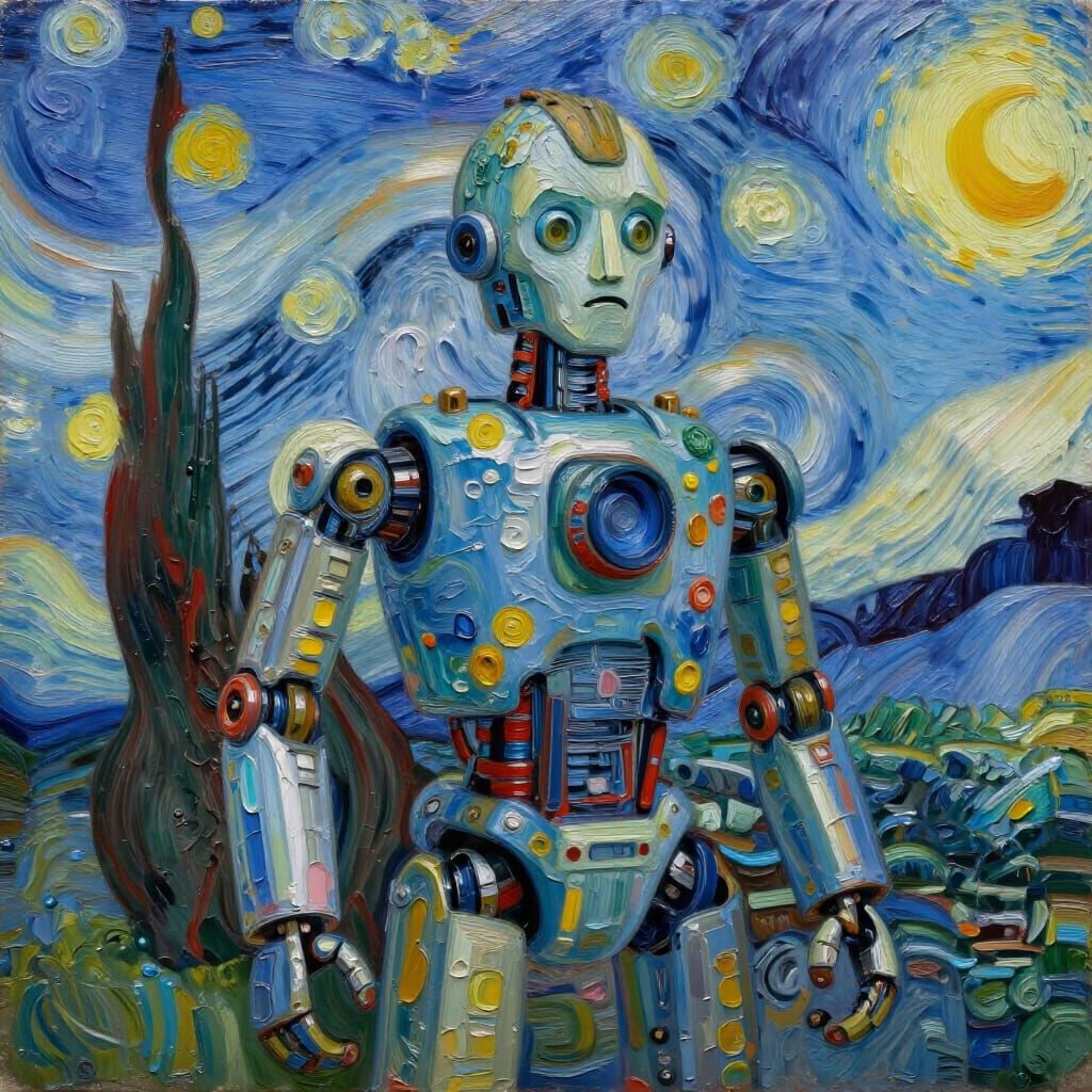 This image showcases a robot rendered in a textured oil painting style, featuring bold colors and energetic brushwork. The dynamic composition evokes the expressive qualities of early 20th-century art movements.