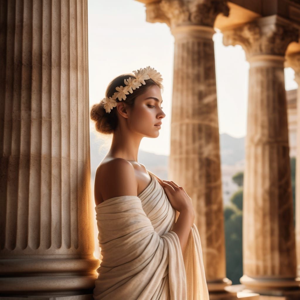 This image shows a serene 21 year old Roman priestess in a temple setting, wearing a flowing white toga and adorned with white flowers, surrounded by warm golden light and intricate marble details.