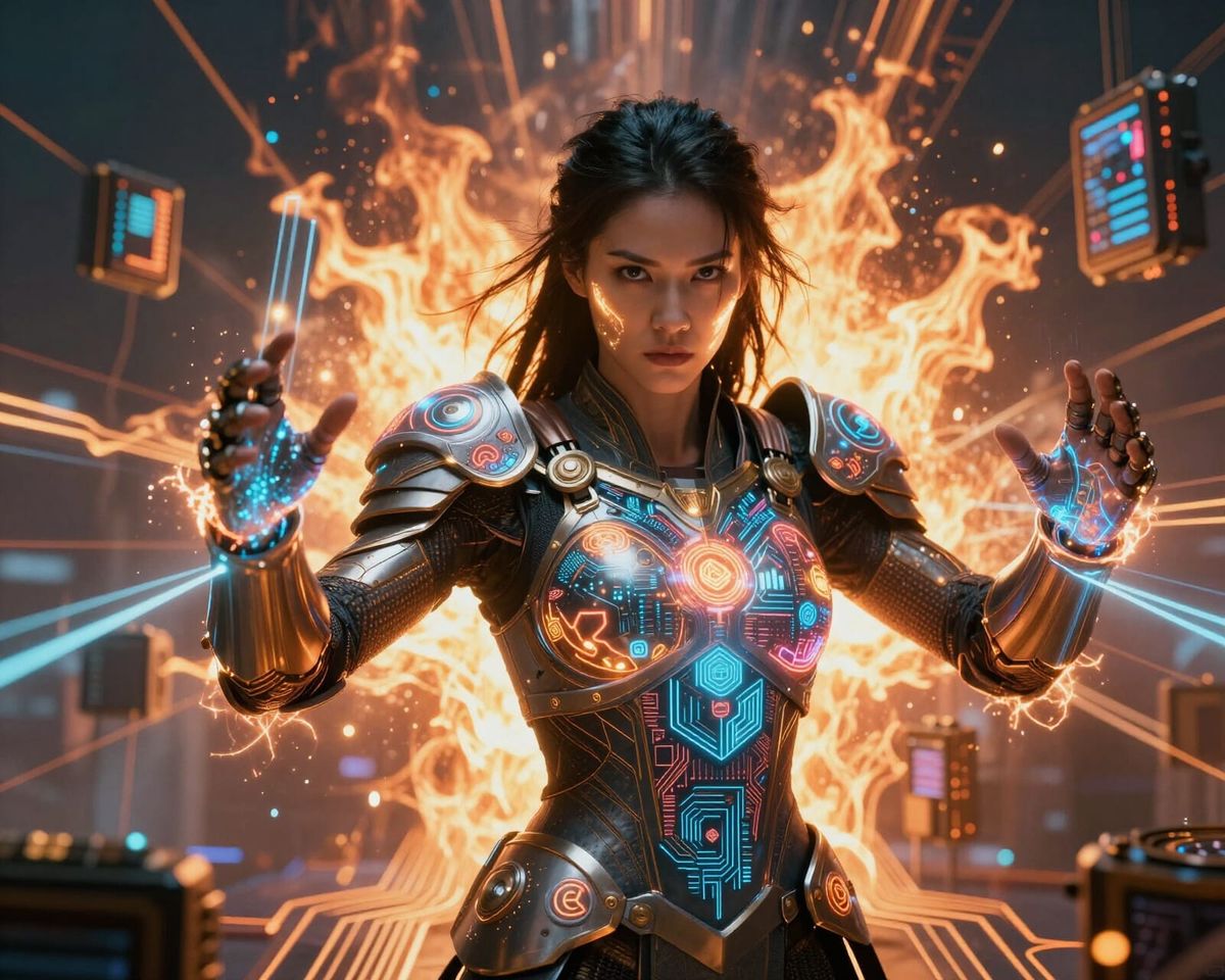 This image shows a fierce woman, the 'Goddess of GPU Acceleration,' emerging from a storm of compute cores. Parallel light beams emanate from her hands, with circuit patterns blooming below. Photorealistic style with cinematic lighting.
