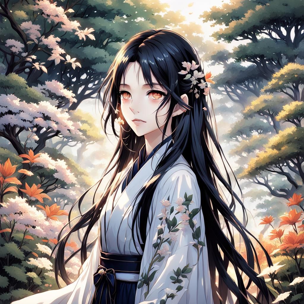 This image shows a beautiful young woman with flowing black hair in a peaceful garden. The portrait, rendered with soft lighting and intricate details, captures the essence of anime art.