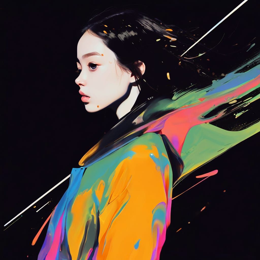 This image shows a girl with straight hair, her shoulders draped with a jellyfish-like bell. The artwork features a smudgy, experimental aesthetic with synthetism color dots, created as UI functional airbrush art.