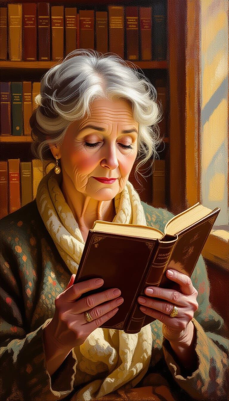 A close-up portrait of aged hands cradling a worn book, set against a softly lit library. Rendered in an impressionistic style with visible brushstrokes, evoking warm, nostalgic light and color.