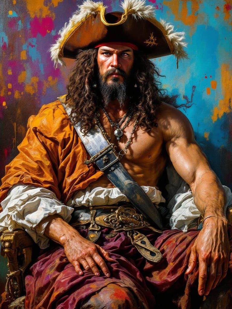This image features Blackbeard in a studio portrait, rendered with hyperbolic excess. It combines luminous glazing, monumental impasto, and maximum saturation for a dramatic, richly-toned effect.